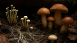 4. この時期は大好きな枯葉がたくさん。分裂とか争いだなんて、いちばん喜ぶのは分解屋の私たちかも♡ でもね、落ち葉同士が肩を寄せてくれるから、私はふわっと広がって森をすばらしく還元できるの。ヒトの社会も、みんなが集まれば、いろんな命が循環できていいのにな、ってつい思うよ〜。